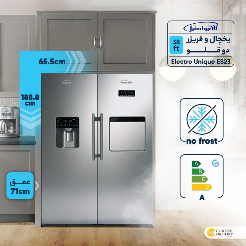 الکترواستیل برای گسترش سبد محصولات خود یخچال و فریزر دوقلو 38 فوت الکترویونیک ES23 را معرفی کرد. یخچال و فریزری که فضای زیادی را در اختیار کاربران قرار داده تا نگران نگه داری از مواد غذایی نباشند. طراحی به روز و دسترسی آسان به امکانات و ویژگیهای مهم این محصول را به گزینه ای مناسب تبدیل میکند. ویژگیهایی همچون مقاومت در برابر برفک با تکنولوژی نوفراست، گنجایش 705 لیتر، آبسردکن و یخساز اتوماتیک و انجماد سریع در کمترین زمان، از مهمترین ویژگیها است. در بخش طراحی، هومبار به منظور دسترسی راحت به داخل یخچال تعبیه شده تا از باز و بسته شدن درب برای موارد غیر ضروری جلوگیری کند. این موضوع نه تنها طول عمر محصول را افزایش می دهد بلکه در بحث راندمان انرژی و مصرف برق هم تاثیر گذار است. دو نمایشگر بر روی درب یخچال و فریزر اطلاعات لحظه ای مورد نیاز را ارائه کرده و کلیدهای برنامه ریزی و مدیریت با جایگیری مناسب، همیشه در دسترس قرار دارند.