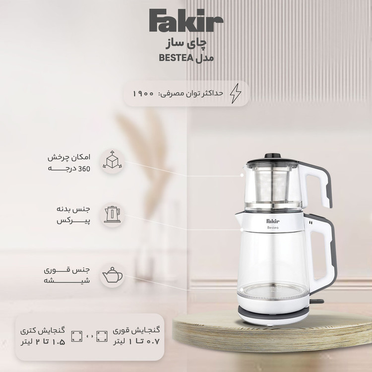 چای ساز فکر مدل Bestea شامل یک کتری پیرکس با ظرفیت 2 لیتر و یک قوری شیشهای یک لیتری است. فیلتر قوری از جنس استیل ضدزنگ است. دسته پلاستیکی کتری و قوری عایق گرما است و پس از به جوش آمدن آب، داغ نخواهند شد و نگران سوختگی نخواهید بود. این کتری برقی دارای المنتی از جنس استیل ضد زنگ است با حداکثر توان 1900 وات کار میکند. قابلیت گرم نگهدارنده باعث میشود هر زمان بخواهید چای و آب جوش آماده داشته باشید. در این چای ساز، قوری روی کتری قرار گرفته و چای شما با بخار آب کتری دم میکشد. کتری قابلیت چرخش 360 درجه داشته و سیم اتصال به برق، به قسمت پایه متصل است که در نتیجه پس از جوشیدن آب، کتری قابلیت جابهجایی دارد. چای ساز فکر Bestea دارای سیستم قطعکن خودکار است و در صورت اتمام آب، چای ساز به طور خودکار خاموش شده و به آن آسیبی نخواهد رسید.