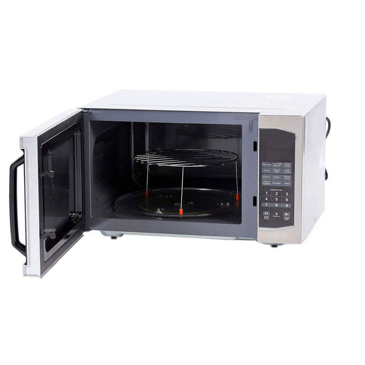 این دستگاه یک مایکروویو رومیزی با طراحی ساده و کلاسیک است که در رنگ نقرهای طراحی و به بازار عرضه شده است. این محصول ظرفیت مناسب برای استفادهی روزمره و معمولی در خانه یا محیط کار را دارد و محفظهی داخلی آن با گنجایش 42 لیتر ساخته شده است. فضای داخلی مایکروویو و همچنین قسمت خارجی بدنهی آن از جنس استیل مقاوم و ضدزنگ ساخته شده است و درمجموع استحکام و مقاومت زیادی دارد. این مایکروویو در حدود 47 سانتی متر طول، 55 سانتی متر عرض و 32 سانتی متر ارتفاع دارد. وزن این دستگاه نیز 24 کیلوگرم است که نسبت به حجم این دستگاه نسبتا متعادل محسوب می شود. شیشه نصب شده روی درب این مایکروویو به گونه ای است که می توانید در هنگام پخت، مواد غذایی داخل دستگاه را مشاهده نمایید. پنل صفحه کلید و نمایشگر دیجیتال این دستگاه در سمت راست قرار گرفته که به راحتی می توان با آن کار کرد و کسانی که تا به حال با اینگونه دستگاه ها کار نکردند نیز می توانند کار کردن با آن را یاد بگیرند. درون محفظهی داخلی ماکروویو سینی چرخان شیشهای قرار دارد که با چرخش مداوم و یکنواخت غذا، پختی همسان را در تمام سطح غذا به وجود میآورد. علاوهبر سینی چرخان، این مدل مجهز به یک سینی فلزی با طراحی شبکهای است.