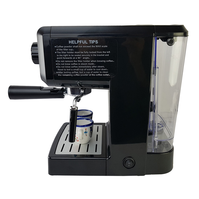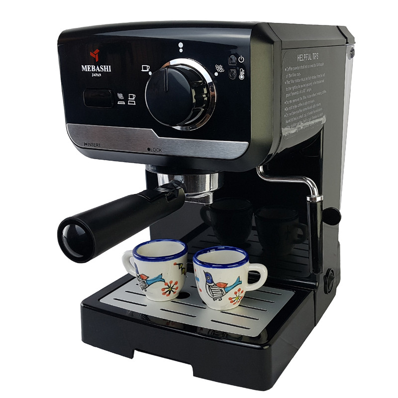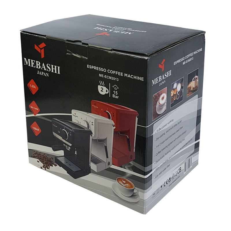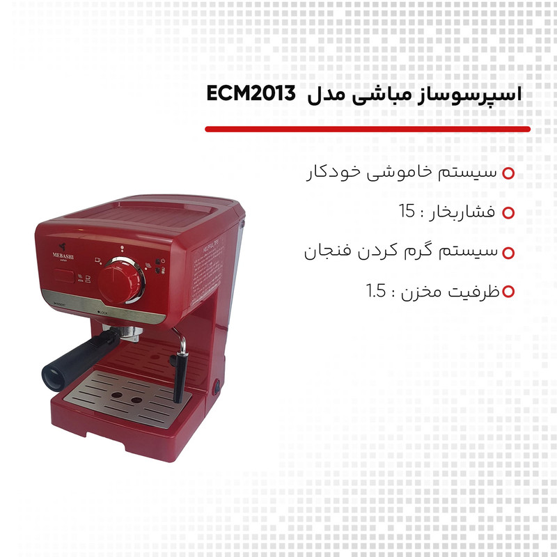 اسپرسوساز مباشی مدل Mebashi ECM2013 یکی از محصولات با کیفیت شرکت ژاپنی مباشی است که جهت مصارف خانگی، اداری، دکه های کوچک، مسافرخانه ها و دیگر محیط های کوچک طراحی و ساخته شده است. جنس بدنه دستگاه از پلاستیک فشرده ABS و با کیفیت ساخته شده، توان دستگاه 1140 وات و قدرت فشار دستگاه 15 بار است.حجم مخزن دستگاه 1.5 لیتر و از تلق شفاف در ساخت آن جهت مشاهده میزان آب داخل مخزن استفاده شده است.از جمله ویژگیهای دیگر دستگاه بویلر ساخته شده از آلیاژ آلومینیوم، سینی چکه گیر با قابلیت جدا شدن جهت تمیز کاری آسان، نازل بخار با قابلیت چرخش جهت فوم گیری آسان همچنین سر نازل با امکان جدا شدن جهت شستشو، سیستم کنترل فشار و حرارت و صفحه گرم نگه داشتن فنجان می باشد.دستگاه مجهز به دو فیلتر تک و دو کاپ جهت عصاره گیری قهوه است. همراه این دستگاه دو عدد فنجان قهوه خوری سرامیکی برند مباشی نیز توسط شرکت مباشی ارائه شده که بسیار جذاب و کاربردی است.جهت تهیه اسپرسو ابتدا آب تصفیه شده را داخل مخزن نهایتا تا زیر خط MAX ریخته و دستگاه را روشن کنید و منتظر بمانید تا دستگاه گرم شود به محضی که چراغ دماسنج روشن شد دستگاه آماده عصاره گیری است در این حالت پودر قهوه را داخل فیلتر زیر خط MAX ریخته و آن را توسط تمپر به میزان مناسب بکوبید سپس پودرهای اضافه را از اطراف فیلتر با دست تمیز کنید و دسته را در جای خود نصب کرده و کلید چرخشی را به سمت چپ (شکل فنجان یا حالت عصاره گیری) بچرخانید تا عملیات عصاره گیری آغاز شود دقت داشته باشید قبل از شروع عصاره گیری کلید فشاری سمت چپ در حالت بیرون یعنی تهیه اسپرسو قرار داشته باشد.جهت تهیه اسپرسو با عطر و خامه عالی به دو عامل 1-درجه آسیاب قهوه (ریزی و زبری) و 2-میزان فشار هنگام تمپ کردن بستگی دارد که این میزان بسته به نوع و قدرت دستگاه متفاوت است که بعد از مدتی کارکرد به صورت تجربی درجه آسیاب و میزان فشار برای دستگاه مورد نظر را یاد خواهید گرفت.