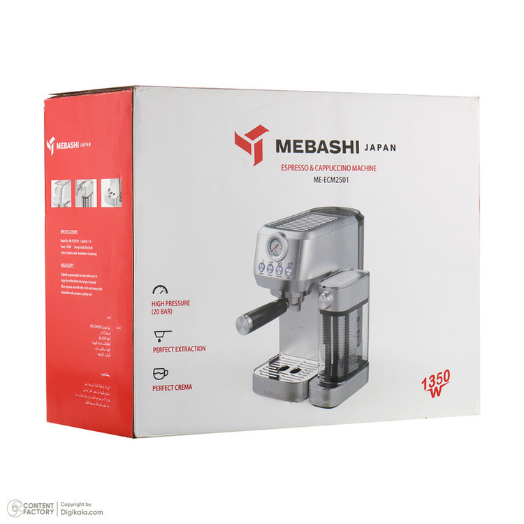 این دستگاه با توان 1350وات یک دستگاه عالی است. فشار بخار این دستگاه 20 بار است که اسپرسو بسیار عالی در اختیار شما قرار میدهد. در کنار این دستگاه ME-ECM-2501 یک مخزن شیر قرار گرفته که شما میتوانید برای کاپوچیو درست کردن از خود دستگاه استفاده کنید.بدنه دستگاه اسپرسوساز مباشی ME-ECM2501 از جنس استیل است که بسیار عالی و زیبا میباشد.مخزن آب این دستگاه اسپرسوساز مباشی ME-ECM2501 که طراحی بسیار زیبا دارد 1.6 لیتر میباشد. مخزن شیر دستگاه550 میلی لیتر است.