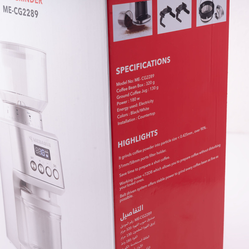 آسیاب قهوه مباشی مدل ME-CG 2289 تحولی جدی در تولید آسیاب در این شرکت است زیرا تمام مشخصات مورد نیاز برای یک آسیاب خوب را داراست. در این آسیاب تیغه ی مخروطی طراحی شده است. تیغه های مخروطی بیشترین دقت در سرعت های پایین را دارا هستند و خصوصا در مقیاس های خانگی قهوه را داغ نکرده و از شروع آسیاب تا انتهای آن سایز پودر یکسان است همچنین حداقل صدای مورد انتظار از یک آسیاب را از آن میتوانید بشنوید. نکته بعد پرتابل بودن تیغه ی مدور این اسیاب و امکان خارج کردن آن و برای تمیز کردن آن است، به این صورت که با باز کردن هاپر (مخزن قهوه) با کشیدن دسته ی متصل به تیغه ی مدور که دور تیغه ی مخروطی قرار دارد، به راحتی میتوانید آنرا جدا کنید. این قابلیت پاکسازی آسیاب را بسیار ساده میکند و نیازی به باز کردن دستگاه برای تمیز کردن تیغه ها نیست. خصوصیت مهم دیگر این آسیاب، صفحه نمایش و برد 4 دکمه، جهت تنظیم تایم آسیاب به صورت برنامه ریزی شده جلوی دستگاه تعبیه شده تا از این دستگاه به صورت اتوماتیک بتوانید استفاده کنید. این دستگاه مخزنی 320 گرمی و بدنه و صفحه برد و دکمه های استیل ، نمایشگر LED، لرزشگیر قوی دارد و صدای آن بسیار کم بوده و قدرت موتور آن 180 وات است. جنس کاسه این آسیاب قهوه استیل ضد زنگ است و در اثر شستشو و استفاده مداوم دچار تغییر رنگ و زنگزدگی نمیشود. شما میتوانید با این دستگاه میوههای خشک را هم آسیاب کنید و در مواقع لازم به راحتی از آنها استفاده کنید. در یک دستگاه آسیاب تیغهها نقش مهمی را ایفا میکنند که تیغههای این محصول 2 پره و همانند کاسه آن از استیل ضدزنگ است که دوام آن را به مراتب بالا میبرد.